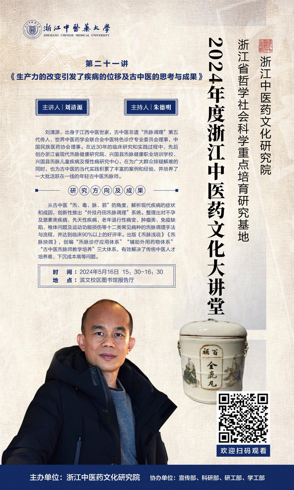 浙江中医药文化大讲堂第二十一讲:刘清源研究员——生产力的改变引发了疾病的位移及古中医的思考与成果