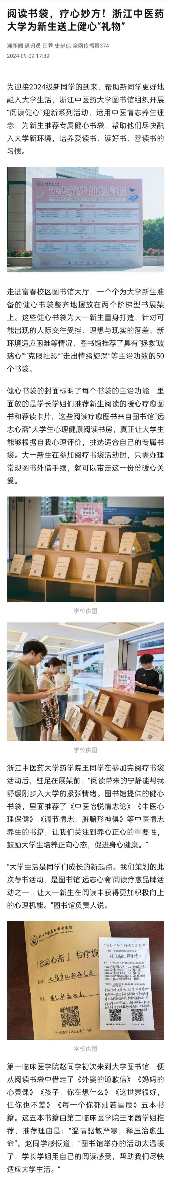 “大学生活是同学们成长的新起点。我们策划的此次荐书活动,是图书馆‘远志心斋’阅读疗愈品牌活动之一,让大一新生在阅读中获得更加积极向上的心理机能。”图书馆负责人说。