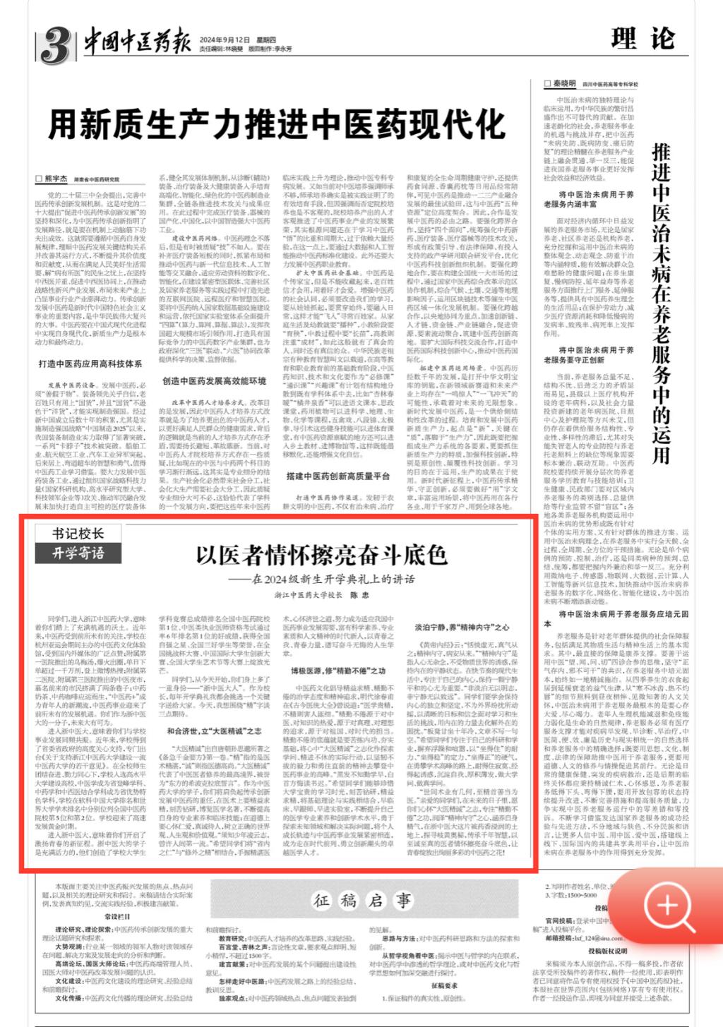 中国中医药报、中国中医药网:以医者情怀擦亮奋斗底色——久久精品一区二区三区四区校长陈忠在2024级新生开学典礼上的讲话