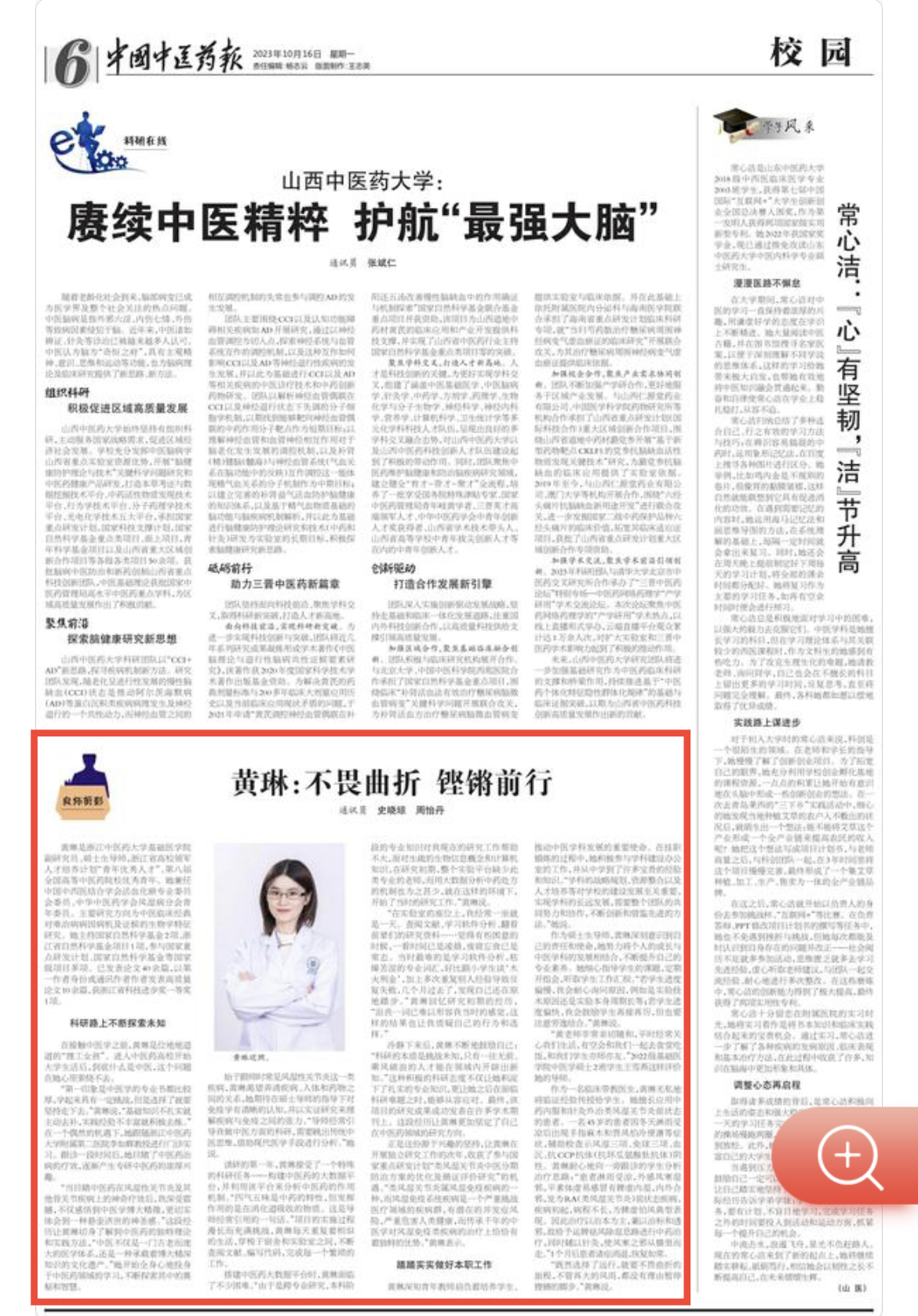 冷静下来后,黄琳不断地鼓励自己:“科研的本质是挑战未知,只有一往无前、乘风破浪的人才能在领域内开辟出新知。”这种积极的科研态度不仅让她积淀下了扎实的专业知识,更让她之后在面临科研难题之时,能够从容应对。最终,该项目的研究成果成功发表在许多学术期刊上。这段经历让黄琳更加坚定了自己在中医药领域的研究方向。