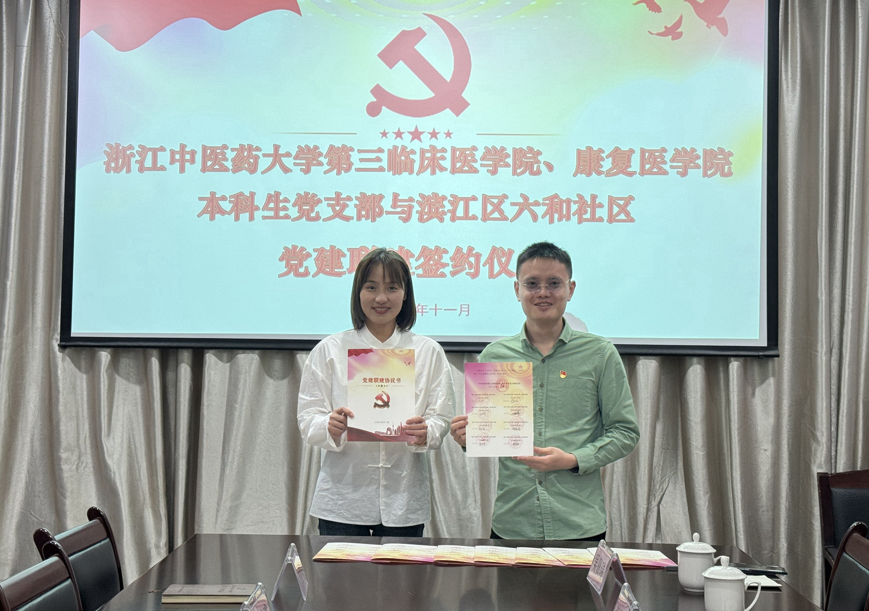 在前期志愿服务的基础上,第三临床医学院、康复医学院本科生党支部与杭州市滨江区六和社区签署党建联建合作协议,一同构建“共享优质资源、共同服务群众”的基层党建联动模式,共同开展志愿服务、文明创建等各项工作,推进社区规范发展、优质发展、创新发展,提升学生的专业实践能力。