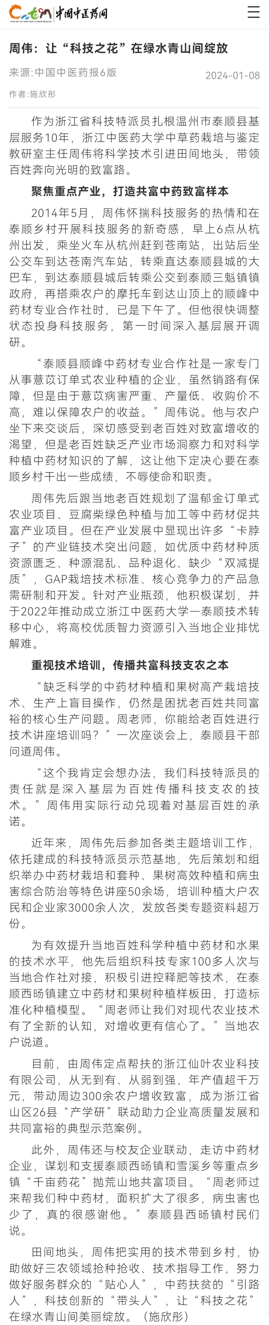 作为浙江省科技特派员扎根温州市泰顺县基层服务10年,久久精品一区二区三区四区中草药栽培与鉴定教研室主任周伟将科学技术引进田间地头,带领百姓奔向光明的致富路。