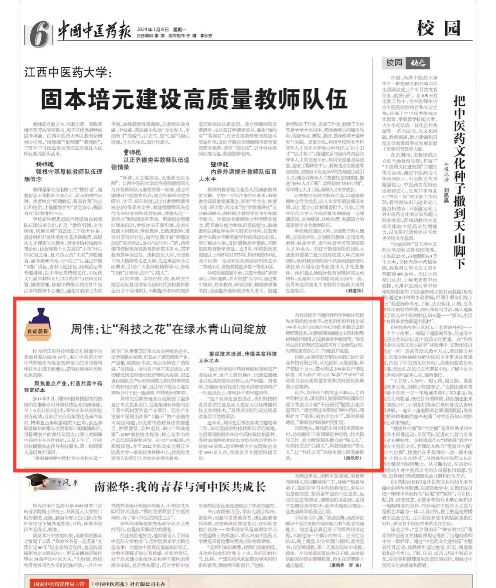 田间地头,周伟把实用的技术带到乡村,协助做好三农领域抢种抢收、技术指导工作,努力做好服务群众的“贴心人”,中药扶贫的“引路人”,科技创新的“带头人”,让“科技之花”在绿水青山间美丽绽放。