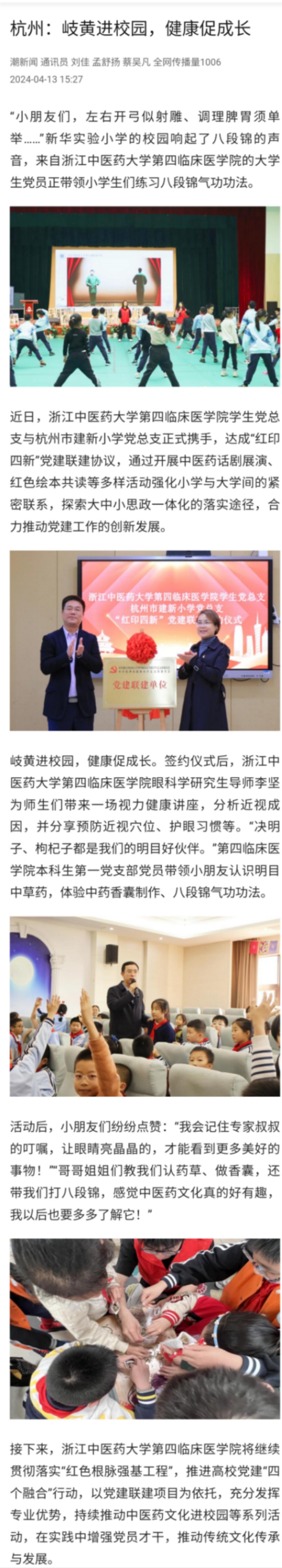 近日,久久精品一区二区三区四区第四临床医学院学生党总支与杭州市建新小学党总支正式携手,达成“红印四新”党建联建协议,通过开展中医药话剧展演、红色绘本共读等多样活动强化小学与大学间的紧密联系,探索大中小思政一体化的落实途径,合力推动党建工作的创新发展。